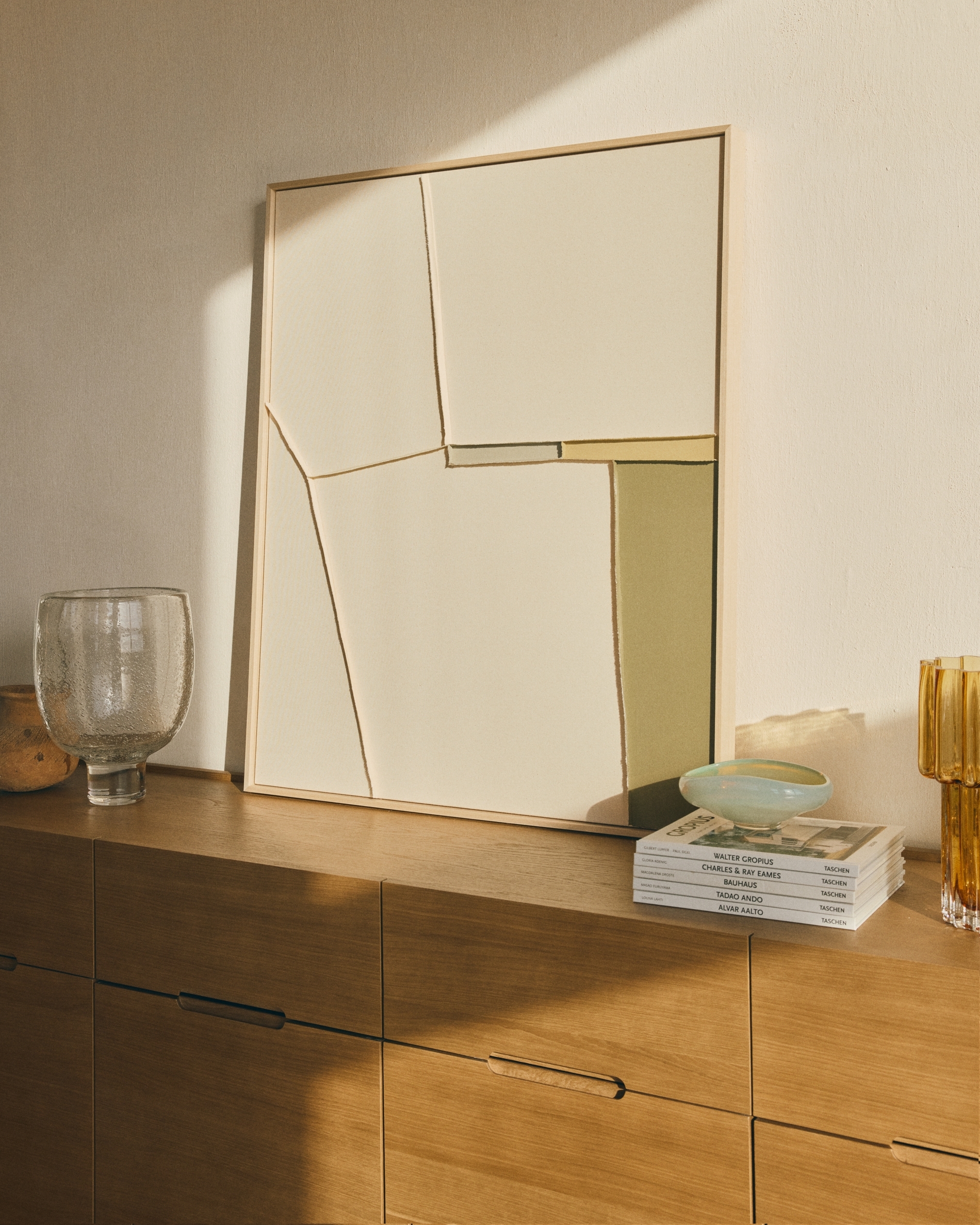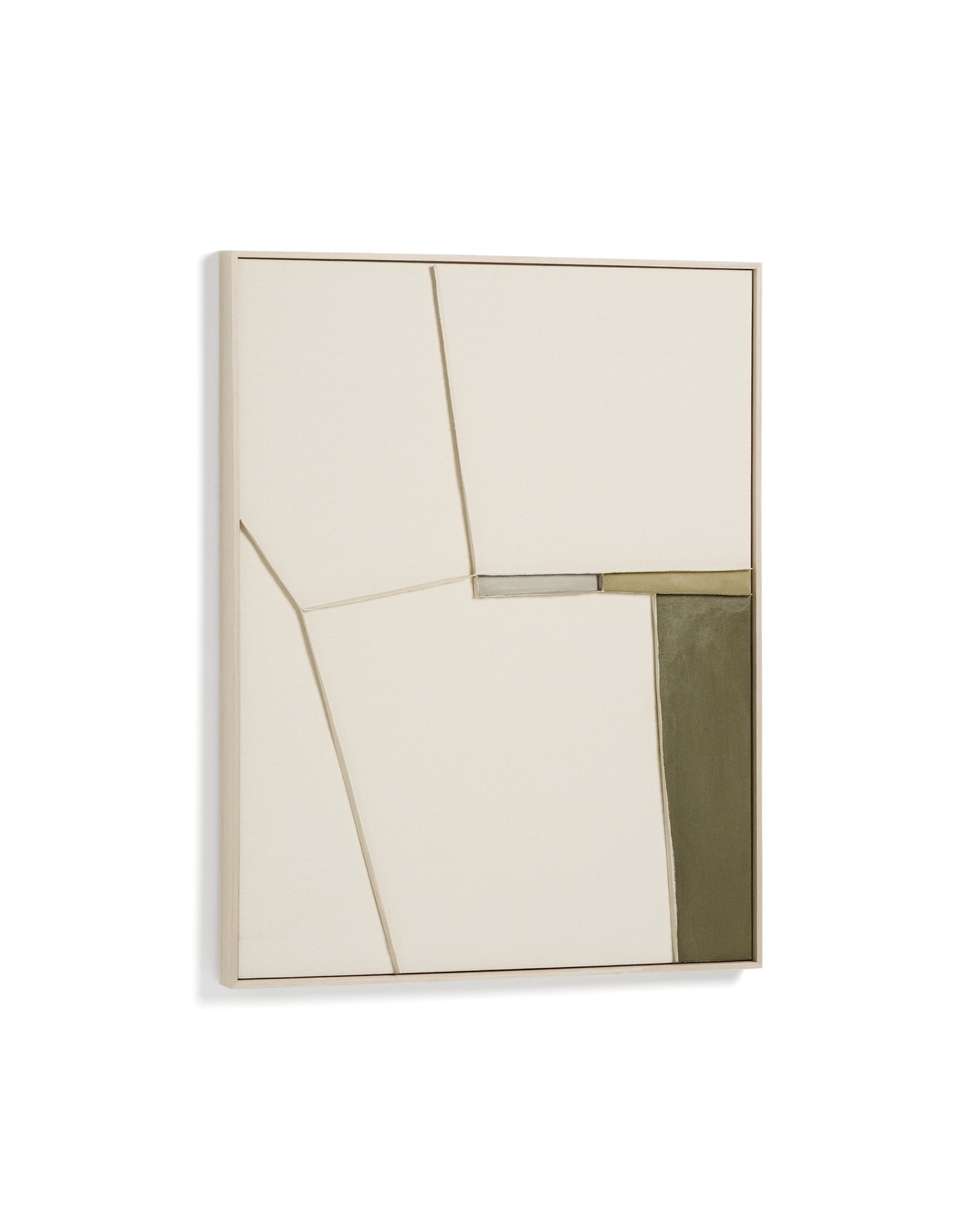 Коллекция Deravia представляет собой абстрактные картины, в которых рельефы, выполненные в технике льняной вышивки, сочетаются с палитрой мягких зеленых и нейтральных тонов. Такие цветовые решения вводят в композицию нюансы, не нарушая её общего баланса, и привносят в пространство ощущение спокойствия.