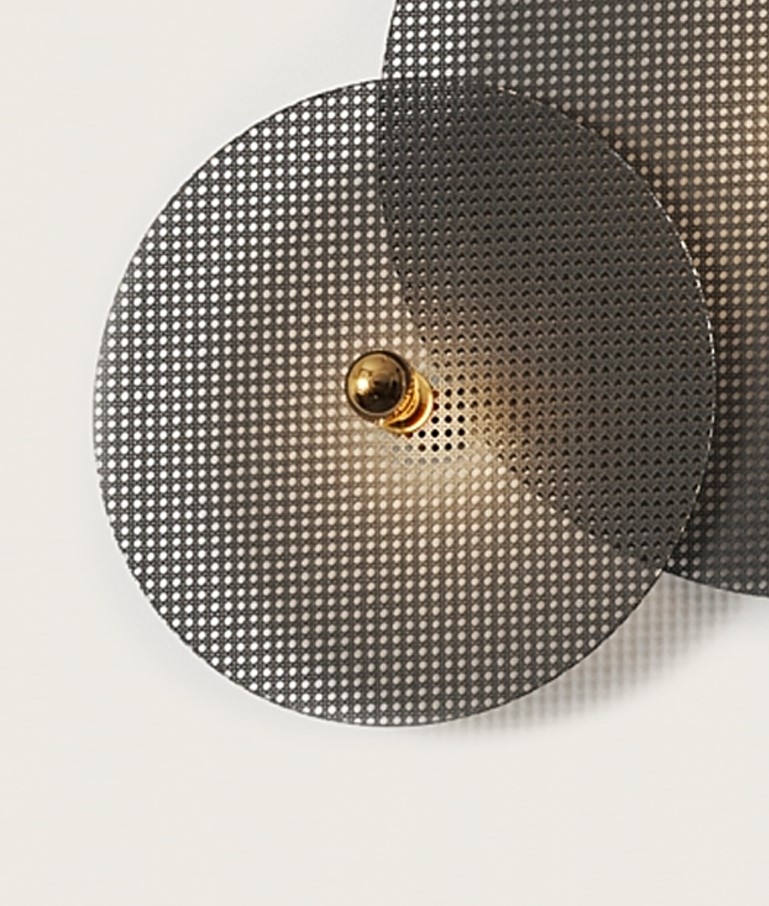 Состоит из металлического фиттинга размером 10 см золотого цвета и рассеивающего диска из ротанга 60 см в черном цвете.