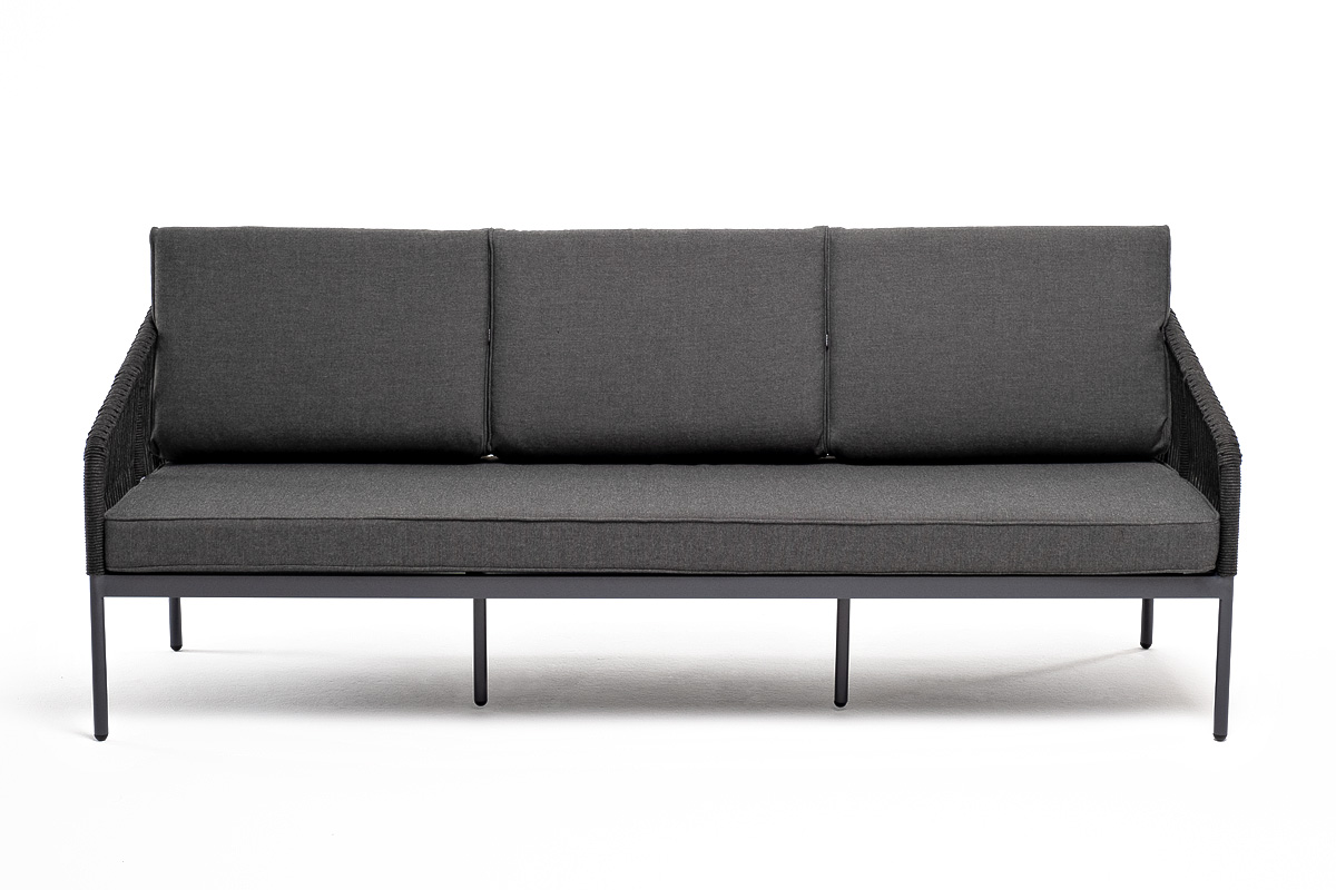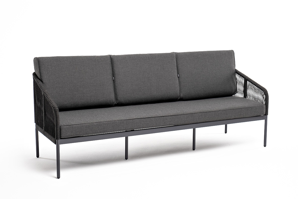 Канны диван 3-местный плетеный из роупа, каркас алюминий темно-серый (RAL7024) муар, роуп темно-серый круглый, ткань темно-серая 027 со скидкой 5% арт. KAN-S-3-001 RAL7024 Mua D-grey(D-gray027)